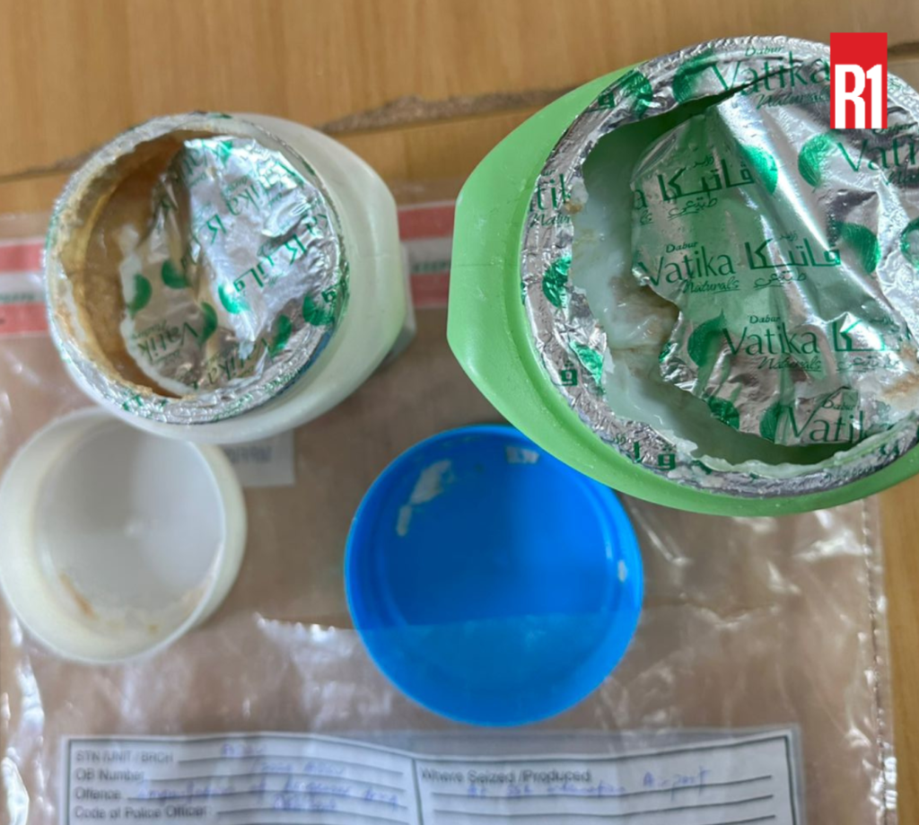 Trois boîtes de crème contenant près de 2,3 kilos de drogue ont été trouvées dans ses bagages.