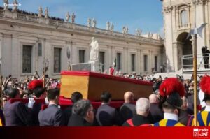 En rupture avec la tradition, le cercueil ne repose pas sur un catafalque, mais est posé à même le sol, à la demande expresse de Jorge Bergoglio…