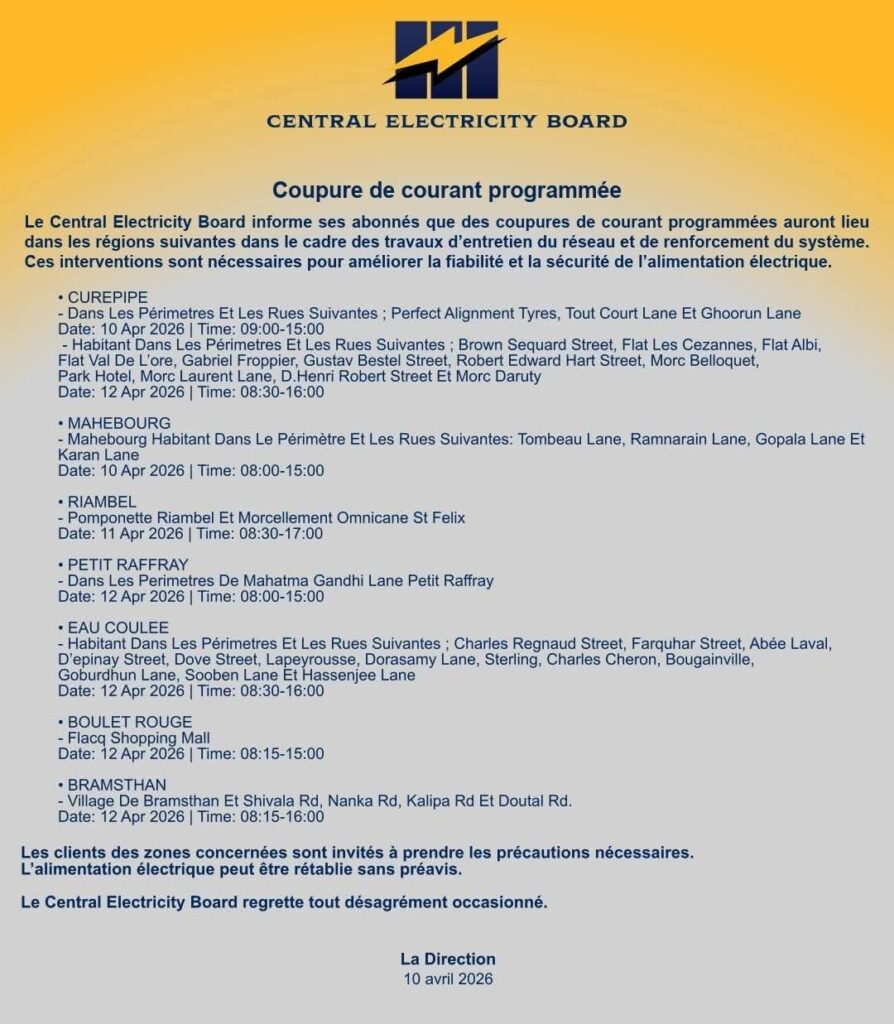 Le Central Electricity Board annonce des coupures de courant programmées les 10, 11 et 12 avril 2026 dans plusieurs régions, dont Curepipe, Eau Coulée, Mahébourg, Riambel, Petit Raffray, Boulet Rouge et Bramsthan.