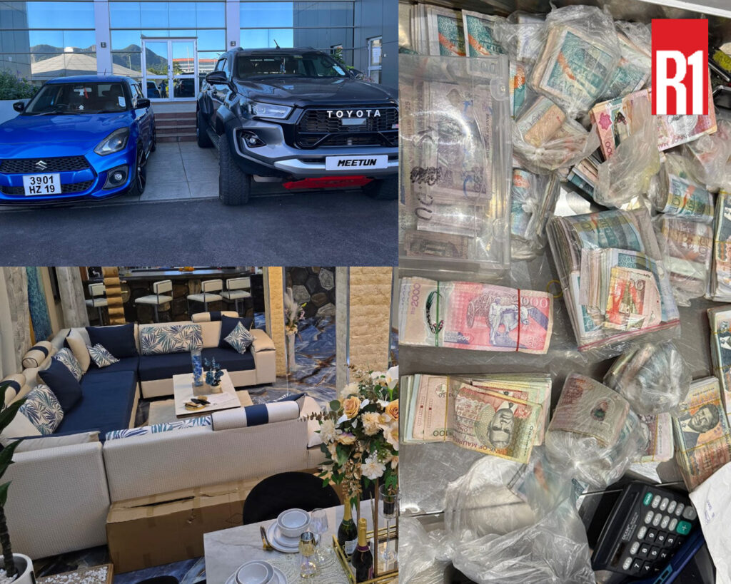 Un 4×4 Toyota Hilux et une Suzuki Swift ont été saisis. De même qu’une somme d’un million de roupies en espèces. Une proche de Gino Meetun, Sarah Calle, a déclaré que l’argent provient des ventes au sein du supermarché qu’elle opère.
