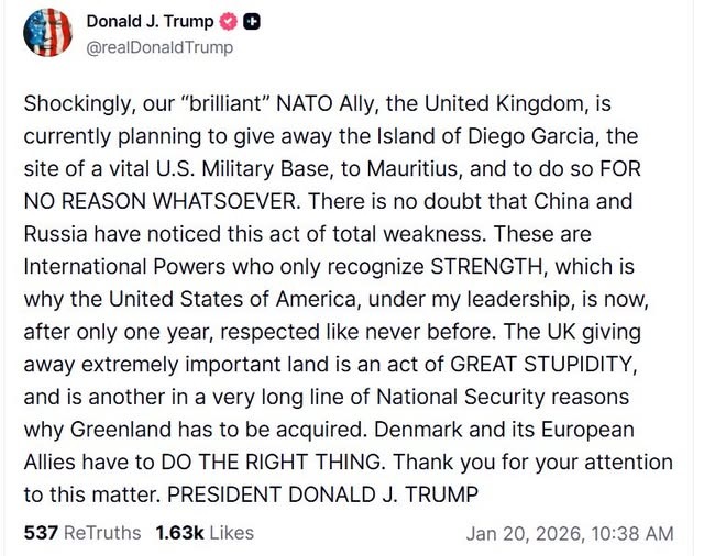 Choqué que notre brillant allié de l’OTAN ait cédé Diego Garcia à Maurice pour aucune raison valable, déclare le président américain Donald Trump sur Truth Social aujourd’hui.